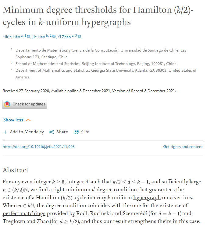 韩杰与智利圣地亚哥大学的HiepHan教授和美国佐治亚州立大学的YiZhao教授在最新的研究中决定了(k/2)一致圈的最优d度条件,其中d至少为k/2, k至少为6。此结果给出了除(k-1)圈外的第一个k-l整除k的(精确)最优结果,并且是第一个对于d<k-2情况的最优结果 (现有的结果都要求d至少k-2)。另外,当n是k的倍数时,此d度条件恰好是保证k超图包含完美匹配的最优d度条件。由于(k/2)一致圈可以分解成两个依次相交的完美匹配,此研究成果加强了Rodl-Rucinski-Szemeredi和Treglown-Zhao关于完美匹配的结果。