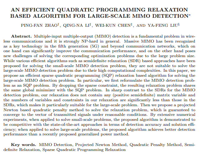 日前,北京理工大学数学与统计学院李庆娜副教授及其研究生赵平凡与合作者在大规模多信号输入输出检测问题研究中取得重要成果“An efficient quadratic programming relaxation-based algorithm for large-scale MIMO detection”,并发表于国际优化领域权威学术期刊《SIAM Journal on Optimization》。该成果提出了一种新的基于指派变量的向量模型,并刻画了该模型松弛问题的精确恢复的理论边界;基于简洁的向量松弛模型,提出了基于识别稀疏支撑集的二次罚方法(PN-QP),能够快速有效处理大规模MIMO问题,达到识别错误率低、速度快的效果。