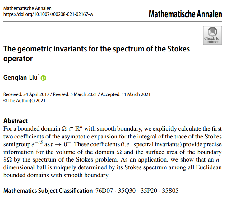 在Stokes流体方程中有一个长期悬而未解的数学问题---流体的Kac问题:能否通过测量Stokes流体振动时发出的频率就能够判断出这片流域的体积和表面积?通俗地说:希望能通过测量一片流域的“波涛声调”来判断这片流域的大小。北京理工大学数学与统计学院刘跟前教授最近在线发表于国际权威数学期刊《Mathematische Annalen》上的一篇论文《The geometric invariants for the spectrum of the Stokes operator》对这一问题给予了肯定的回答,从而彻底地解决了这个著名的流体Kac问题。