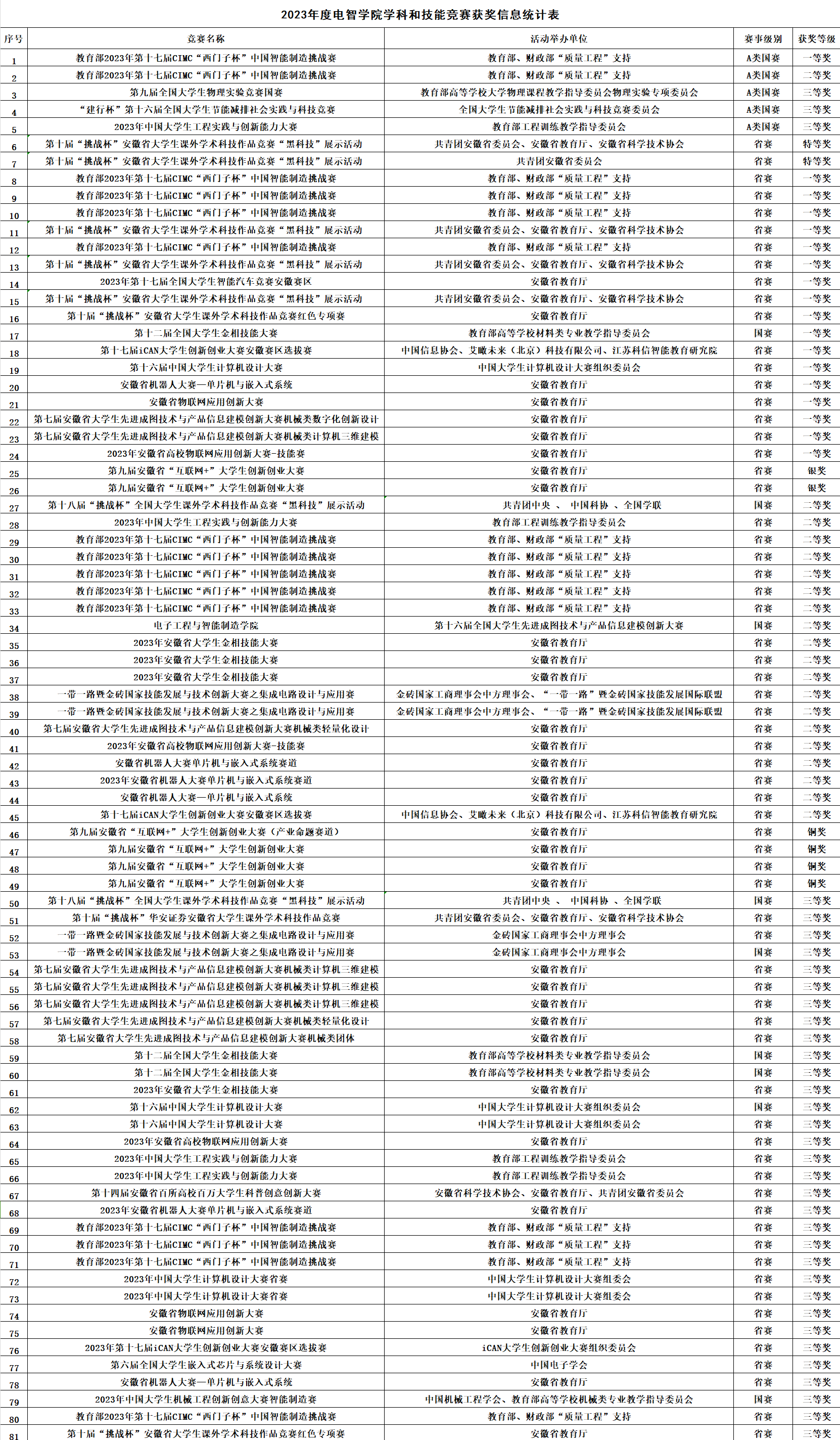 2023年度,太阳成集团tyc234cc学生参加A、B类学科竞赛获得国赛和省赛奖励共计81项,其中A类赛事国赛获奖5项,包括一等奖和二等奖各1项,三等奖3项,实现A类赛事国赛一等奖和总获奖数量的突破。B类赛事共计获得特等奖2项、一等奖17项、二等奖22项、三等奖36项,获奖等级和数量较往年都有所提升。学院获太阳集团tyc234cc2023年“互联网+”大学生创新创业比赛和“挑战杯”大学生课外学术科技作品竞赛优秀组织奖。