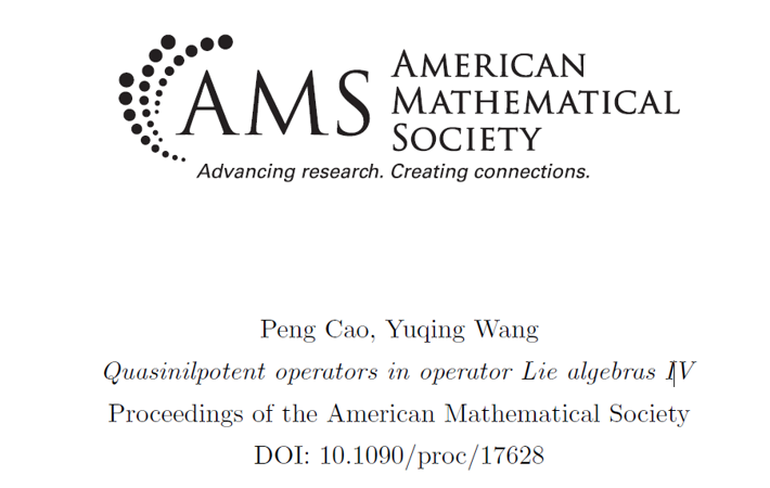 近日,学院2022级强基计划本科生王雨晴与合作导师曹鹏的研究论文《Quasinilpotent operators in operator Lie algebras IV》,在数学领域重要期刊《Proceedings of the American Mathematical Society》在线发表。此项成果不仅是学院拔尖创新人才培养模式的成功实践,也标志着本科生已具备参与并推动前沿数学研究的能力。