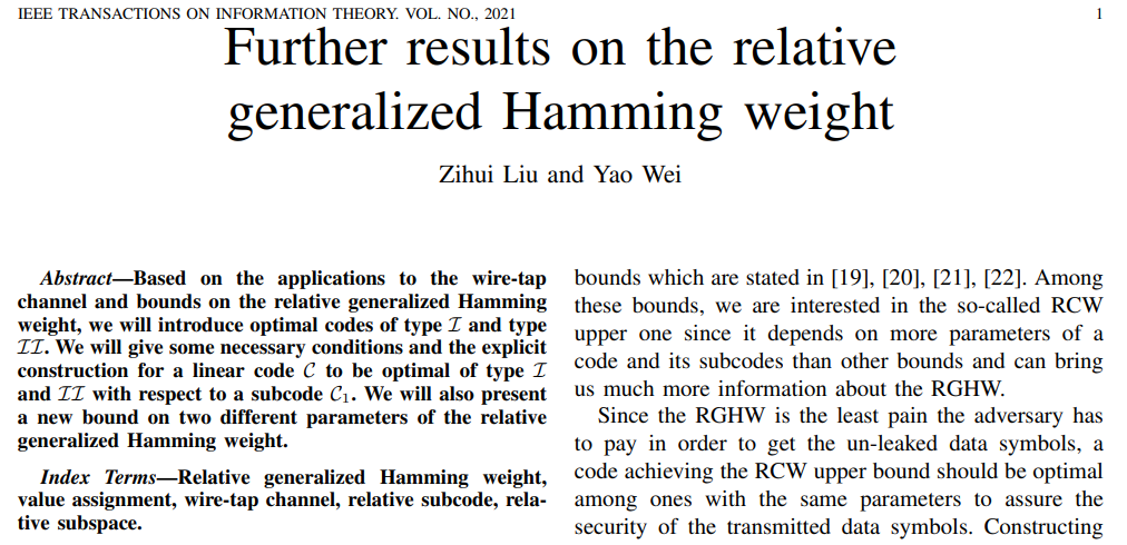 北理工在相对广义汉明重量方面取得新研究成果