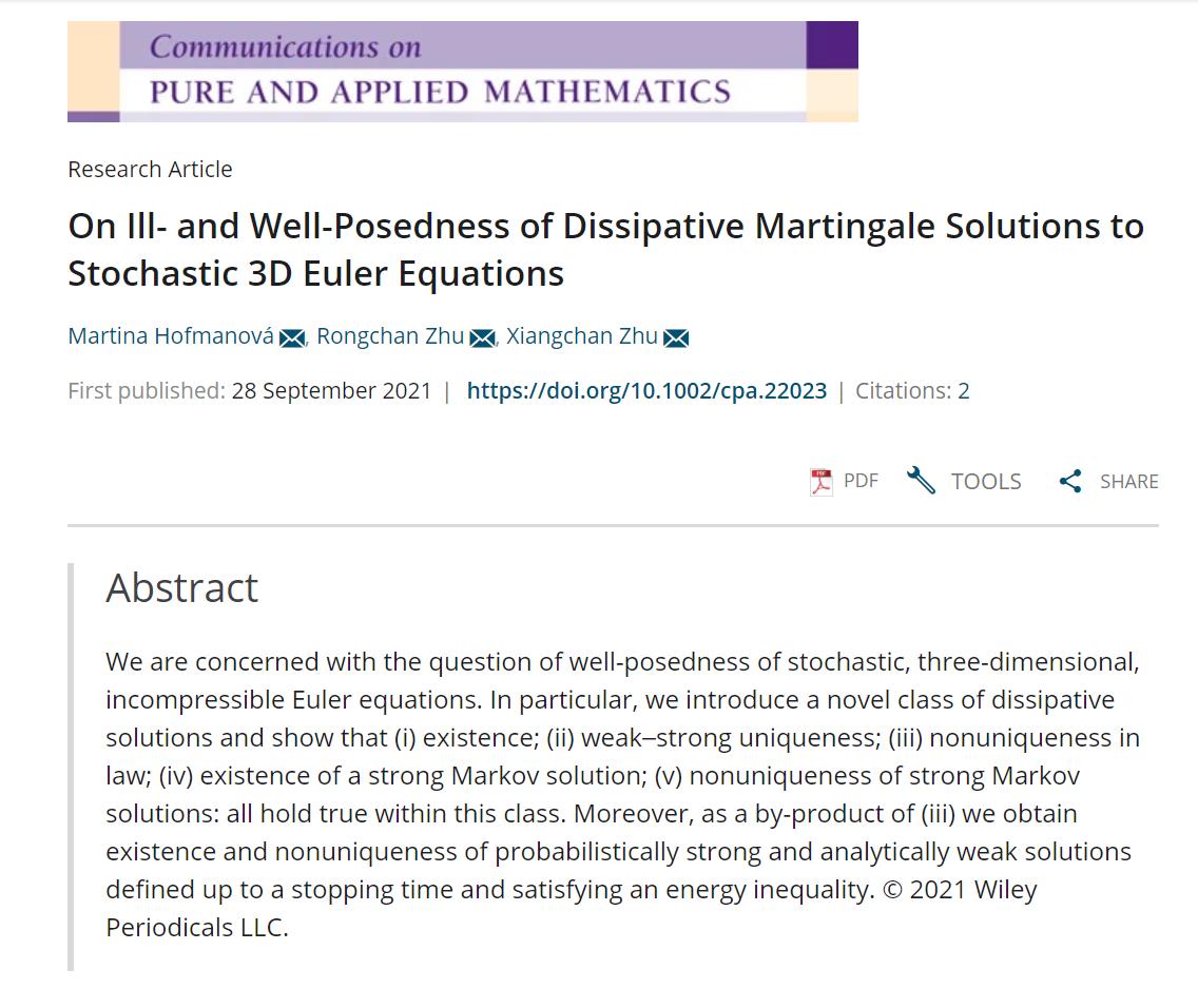 日前,北京理工大学数学与统计学院朱蓉禅教授在国际顶级学术期刊《Communications on Pure and Applied Mathematics》上发表了题为《On Ill- and Well-Posedness of Dissipative Martingale Solutions to Stochastic 3D Euler Equations》的研究论文。该研究首次对于随机三维欧拉方程提出了耗散鞅解的概念并证明了耗散鞅解的存在性、弱强唯一性、分布不唯一、马氏解的存在性和不唯一性。更进一步,朱蓉禅教授和合作者证明了随机三维Navier-Stokes方程的马氏解不唯一,并对随机三维Navier-Stokes方程首次构造了概率意义的强解,解决了随机偏微分方程领域一个困扰多年的问题。相关结果近期被概率论顶级期刊《The Annals of probability》接收。