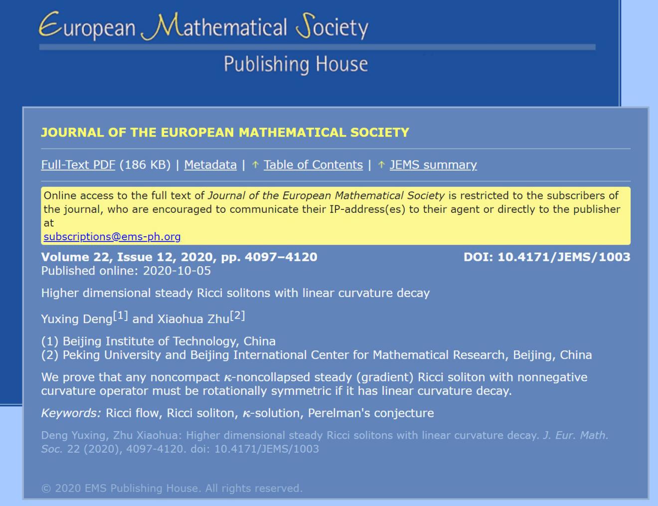 日前,北京理工大学数学与统计学院邓宇星教授在国际顶级学术期刊《Journal of the European Mathematical Society》发表题为“Higher dimensional steady Ricci solitons with linear curvature decay”的研究论文。该论文证明了当维数不小于4时,数量曲率线性衰减并且具有非负曲率算子的体积非塌缩稳态型里奇孤立子必然旋转对称。也就是说,这类孤立子或者同构于欧式空间,或者同构于Bryant孤立子。当维数为4时,曲率算子非负条件可以减弱成截面曲率非负。