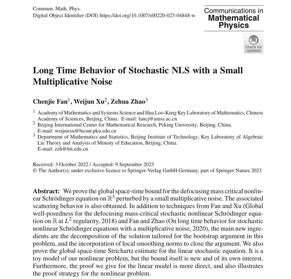 日前,北京理工大学数学与统计学院教师赵泽华(通讯作者)与中科院数学与系统科学研究院教师范晨捷、北京数学中心教师许惟钧合作在期刊《Communications in Mathematical Physics》上合作发表题为《Long Time Behavior of Stochastic NLS with a Small Multiplicative Noise》的研究论文。该论文研究方向为随机偏微分方程,得到了带小可乘噪音的随机型薛定谔方程的长时间行为结果,使得此结果的成立不需要此前德国著名数学家Röckner教授团队关于噪音的衰减假设(Herr-Röckner-Zhang [Comm. Math. Phys., (2019) 368, 843-884])。