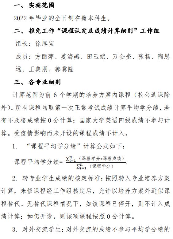 数学与统计学院2022年推荐优秀应届本科毕业生 免试攻读研究生工作课程认定及成绩计算细则
