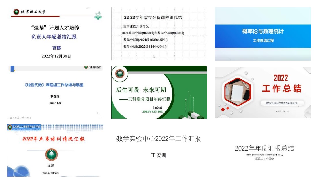 强基计划专业负责人曹鹏老师介绍了强基计划专业建设和人才培养情况,公共课负责人方丽萍、房永飞、李春辉、闫晓霞、赵阳老师分别介绍了公共课程运行建设情况,就课程建设、教材建设、教学改革项目、教学改革论文、教学成果奖申报、创新教学大赛、教师教学能力提升才培养等方面进行了详细报告,结合学校人才培养大讨论的要求,重点介绍了本年度人才培养具体工作,并对课程建设和改革提出了思考和建议。学科竞赛负责人王宏洲、李保奎、王博、熊春光老师分别介绍了学科竞赛辅导团队建设情况,学科竞赛人才培养情况,提出了学科竞赛人才培养过程中发现的问题,以及相应的举措和今后工作的建议。