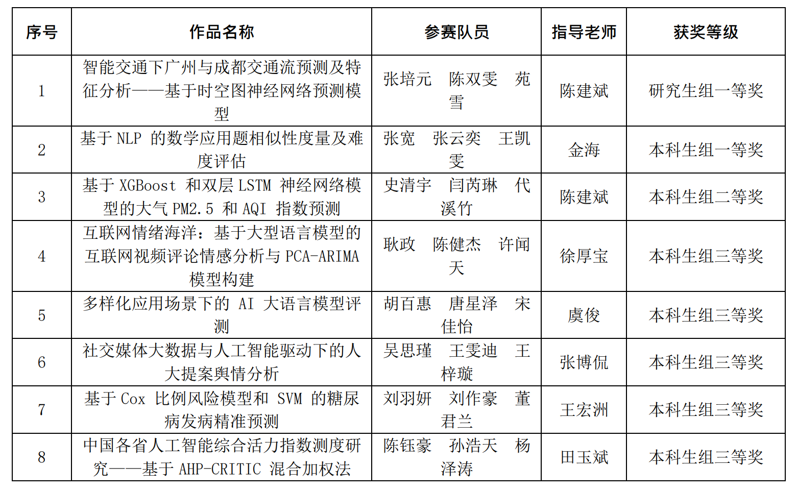 在本届比赛中,由2023级研究生张培元、陈双雯、苑雪3位同学完成的论文《智能交通下广州与成都交通流预测及特征分析——基于时空图神经网络预测模型》获全国赛研究生组一等奖。