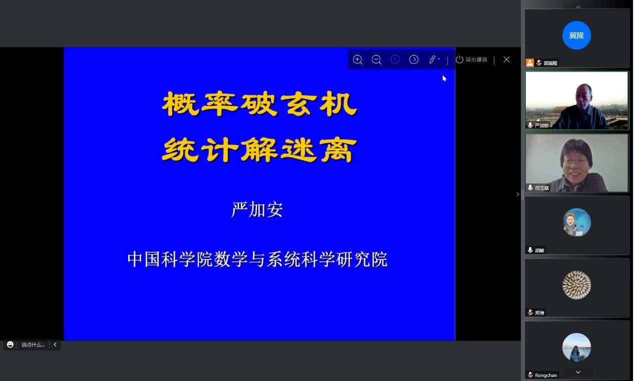 2022年10月7日,应北京理工大学数学与统计学院张让让老师邀请,中国科学院院士、中科院数学与系统科学研究院研究员严加安教授做了题为“概率破玄机,统计解迷离”的线上报告。数学与统计学院院长田玉斌、拔尖基地2.0负责人胡峻、学院教师及本科生代表等100余人参加了会议。