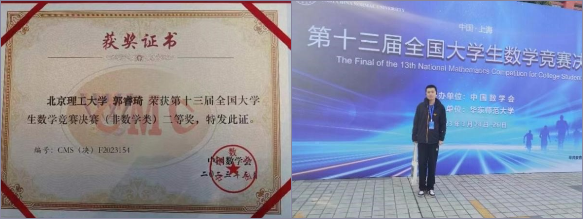 在本届比赛中,北京理工大学数学与统计学院2019级本科生田草林位列数学专业A类高年级组第五名,荣获全国一等奖。
