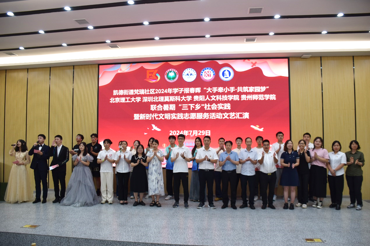 7月29日,在江口县人民政府和凯德街道的大力支持下,开展了梵瑞社区2024年学子报春晖“大手牵小手·共筑家园梦”四校联合暑期三下乡社会实践暨新时代文明实践志愿服务活动文艺汇演,大学生和小朋友们载歌载舞,在欢快愉悦的氛围中,实践活动落下帷幕。