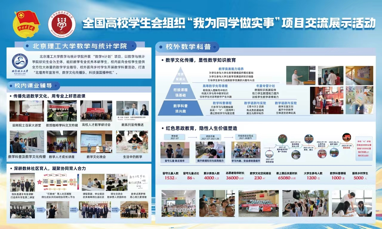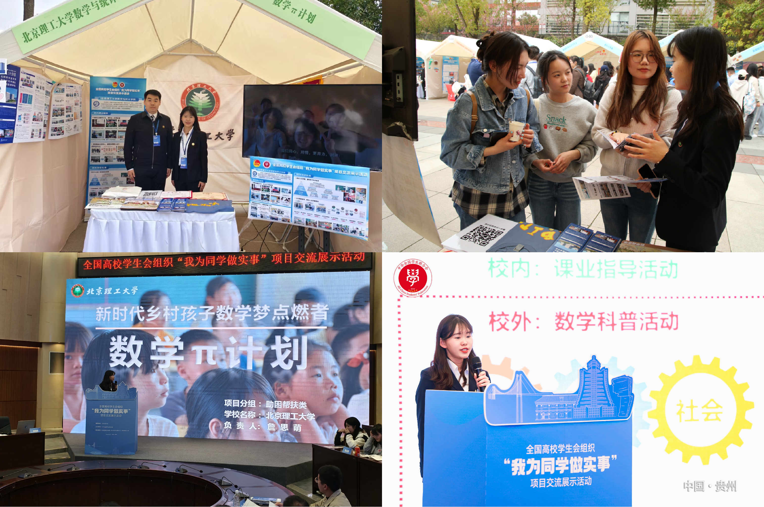 2024年3月24日,由共青团中央指导、全国学联主办、贵州省学联承办的全国高校学生会组织“我为同学做实事”项目交流展示活动在贵州师范大学圆满落幕。北京理工大学数学与统计学院研究生会“数学π计划”项目经学校自荐、省级推报、全国遴选、现场答辩等环节,在全国1724所高校的3581个项目中脱颖而出,入选全国高校学生会组织“我为同学做实事”精品项目(全国100项,其中普通高校研究生会精品项目30项)。