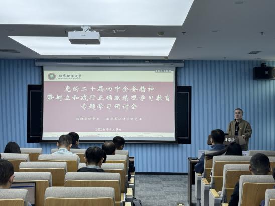 为深入学习贯彻党的二十届四中全会精神,推动树立和践行正确政绩观学习教育走深走实,促进理论学习与学科发展深度融合,2026 年 4 月 9 日,数学与统计学院、物理学院在文萃 E708 报告厅联合举办党的二十届四中全会精神暨树立和践行正确政绩观学习教育专题学习研讨会。两学院相关领导、教师党支部书记及教师党员代表参加会议,会议由数学与统计学院党委书记邹锐主持。